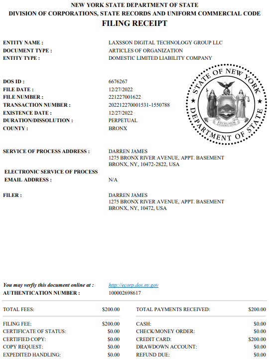 Laxsson attempts to establish its legitimacy by proclaiming to be a U.S.-registered company with a license from FinCEN. However, a closer look reveals that this license does not provide any governmental approval or validation of their operations. The company’s provided address is a residential home, not a business office, adding another layer of suspicion to their legitimacy. Furthermore, the actual date of the company’s registration is 12/2/2022, contradicting their assertion of operational history since 2016.