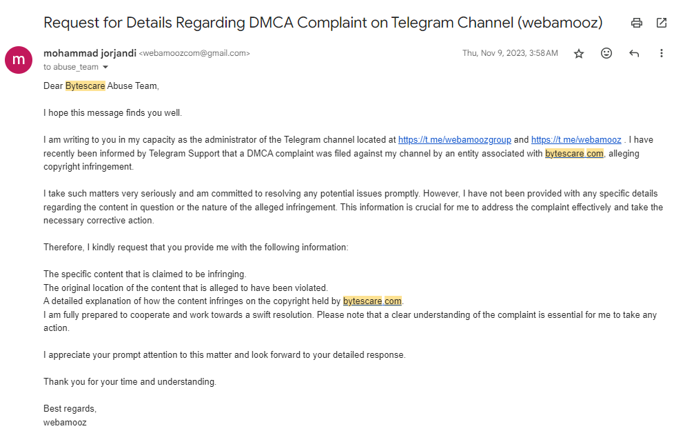 - November 23, 2023: After all suspensions were lifted, we sent a formal email to Bytescare, demanding them to stop aiding Farzin Fardin Fard in abusing the DMCA process to silence journalists and suppress information. We warned them that their continued actions would result in us publicly exposing their unethical practices.