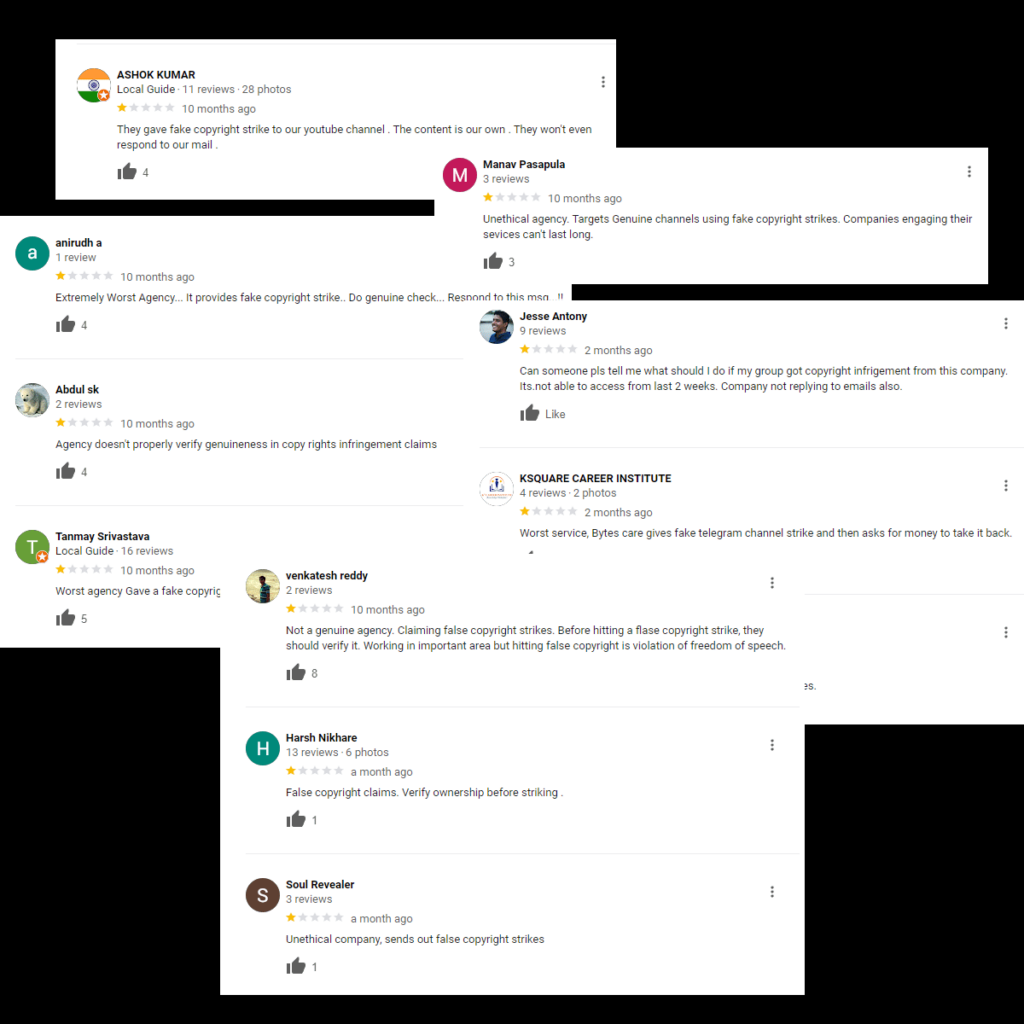 Google reviews show that Webamooz is not alone—many others report Bytescare targeting genuine channels with fake copyright strikes. This pattern highlights widespread abuse of the DMCA process, threatening freedom of speech for many creators.